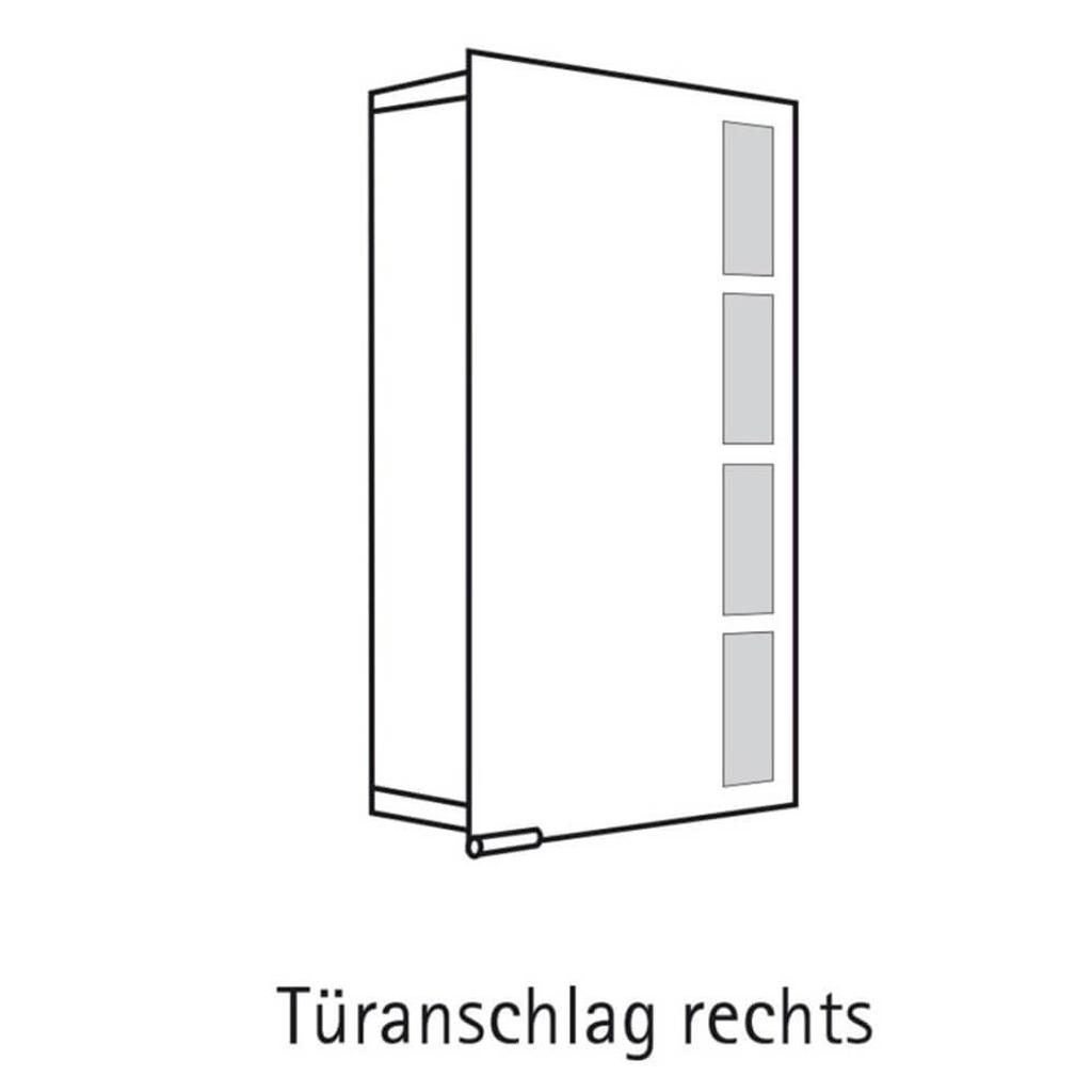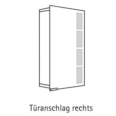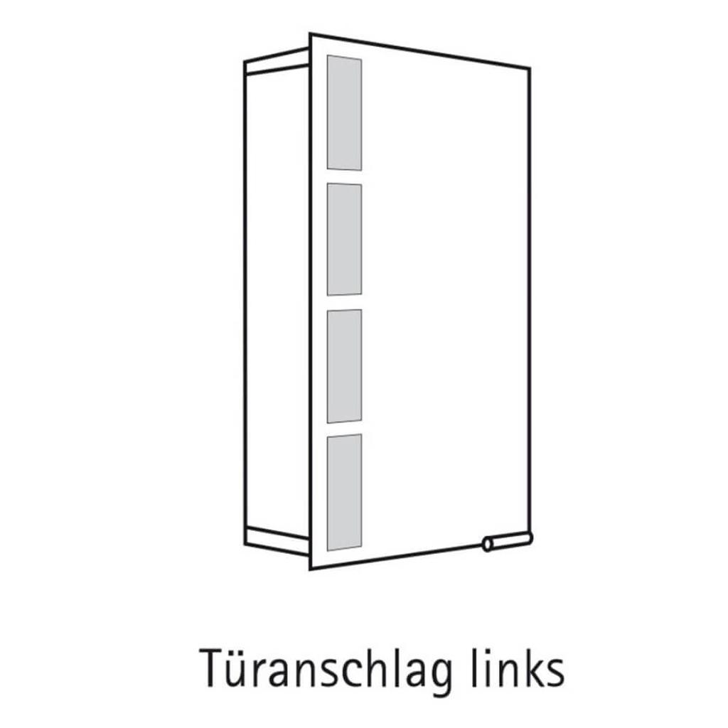 Beachten Sie, dass der Tür-Anschlag die Seite ist, an der sich die Scharniere befinden! Die Scharniere befinden sich so zum Beispiel bei einem linken Türanschlag auf der linken Seite, wodurch der Griff zum Öffnen der Spiegeltür immer auf der gegenüberliegenden Seite, also rechts sitzt.