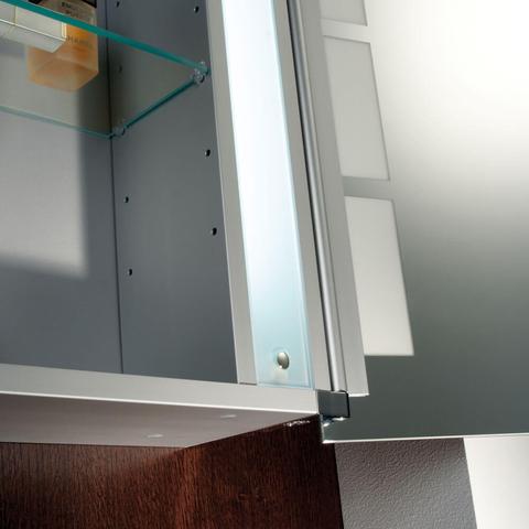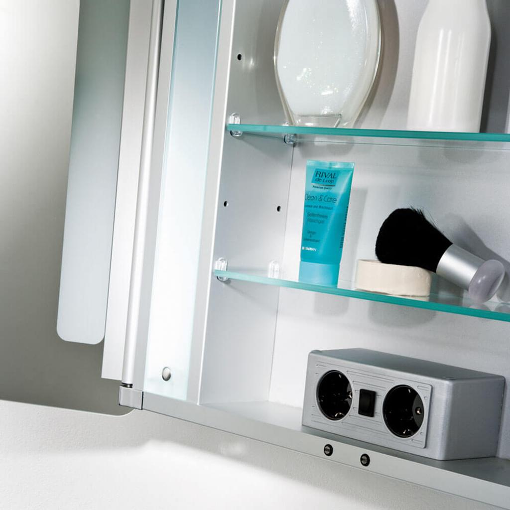 Frisches und modernes Design prägen die Spielschränke aus der Serie ASP 500. Doch neben den geradlinigen Formen und der eleganten (blendfreien) Beleuchtung hat dieser aus Aluminium gefertigte Spiegelschrank weit mehr zu bieten! Durch den großzügigen Innenraum können Sie sämtliche Utensilien verstauen und schaffen so Ordnung in Ihrem Bad. Für den optimalen Stauraum sorgen drei höhenverstellbare Glasböden, wodurch Sie die Höhe der einzelnen Elemente genau nach Ihren Bedürfnissen bestimmen können. Ein weiteres Highlight ist der integrierte Doppelstecker inklusive Lichtschalter. Versorgen Sie Ihren Fön oder Ihr Glätteisen bequem direkt im Spiegelschrank mit Strom oder laden Sie Ihre Zahnbürste versteckt auf! Doch auch beim Fönen müssen Sie keineswegs auf eine große Spiegelfläche verzichten! Durch die Doppelspiegel-Türen haben Sie auch auf der Innenseite der Türen eine Spiegelfläche. Neben all' diesen Vorteilen kommt auch die Qualität bei HSK nicht zu kurz: So sorgt beispielsweise das innovative Scharniersystem für den größtmöglichen Öffnungswinkel.