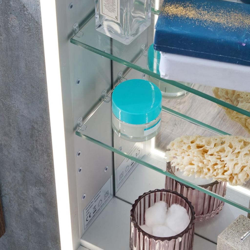 Dieser stilvolle Spiegelschrank aus Aluminium bietet Ihnen reichlich Platz für Ihre Badezimmerutensilien und sorgt für einen ordentlichen, aufgeräumten Look. Er überzeugt mit einer energiesparenden LED-Beleuchtung welche über einen Bewegungssensor Ein- und Ausgeschaltet werden kann. Die Spiegeltür verfügt über Scharniere mit Soft-Close Mechanismus, welche ein Zuschlagen verhindern.
